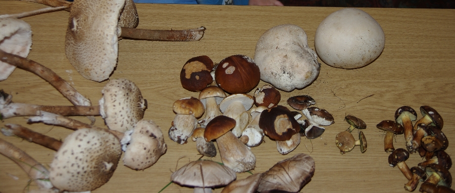 zu sehen sind Sommersteinpilze,Parasole,Wiesenchampions,Ein paar Maronen,ein paar Filzis(Ziegenlippen),Babyriesenboviste