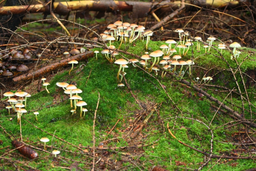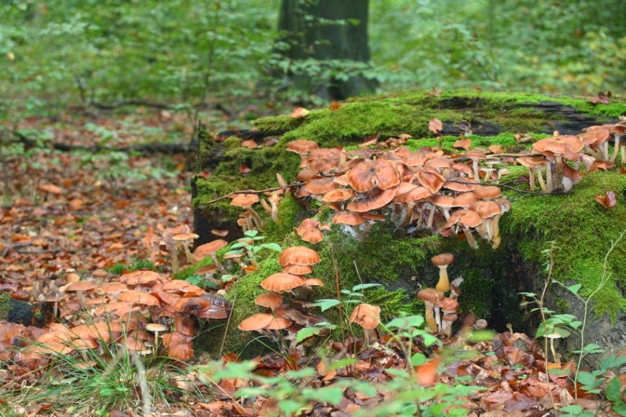 Dafür ist jedes Stückchen Holz, ob tote Äste, Baumstümpfe oder andere Holzreste mit Hallimasch, Stockschwämmchen usw. übersät. Anscheinend legen nicht viele Pilzsammler wert auf den Hallimasch, denn man könnte mit der Sense in ein paar Minuten reiche Beute machen. Einige Hallimasch sind so alt, dass die Hüte tellergroß sind.8|