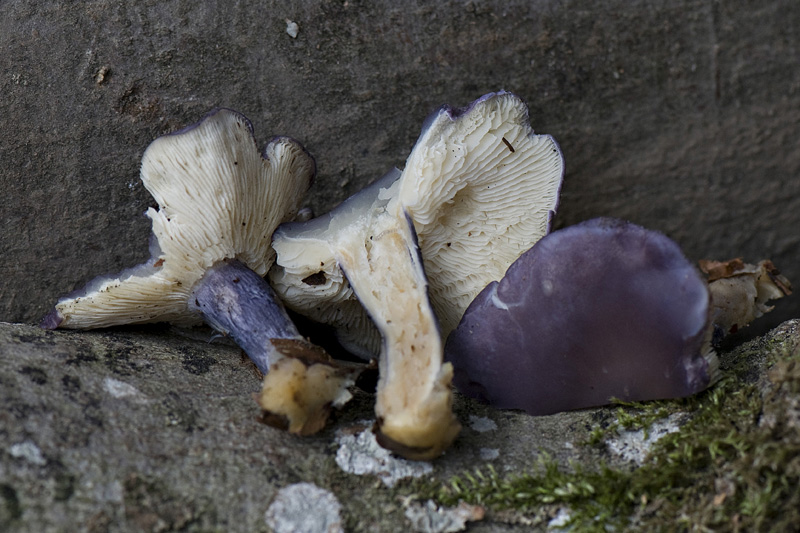 Es könnte sich um einen Calocybe ionides, Veilchenblauer Schönkopf handeln. Anzumerken sei, dass das Foto nicht am Fundort entstand da ich keine Kamera dabei hatte. Es gab insgesamt ein gutes dutzend dieser Pilze am Wegrand (Schotter), über Muschelkalk. Die Pilze wuchsen auf dem Boden neben grossen gefällten Bäumen. Durchmesser des Hutes 5 cm, Stiel 4 cm lang und zirka 0,5 cm dick, faserig. Könnte das passen, würde mich über Hinweise freuen.