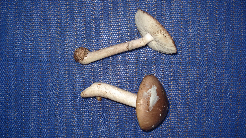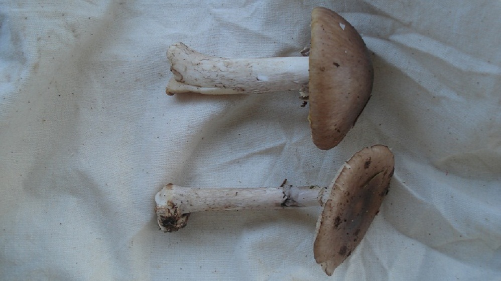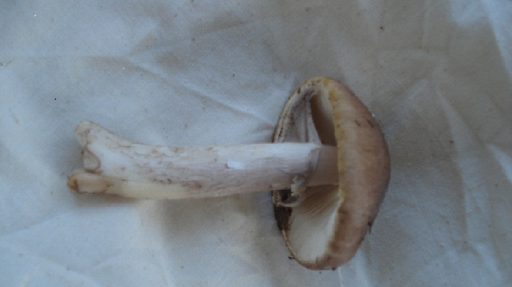 Zu den Daten: es handelt sicht bei dem helmigen Exemplar um einen Lamellenpilz. Die Lamellen waren durch ein Velum partiale verdeckt, dass leicht lilafarben war (was hauptsächlich der Grund war, dass ich es für einen Champignon hielt). Die Stielbasis war knollig. Der linke hatte keinen Ring, der rechte einen stark abgelösten. Der Helm des größeren Exemplars hat vielleicht sieben bis acht Zentimeter Durchmesser. Beide standen am Rand eines Fichtenwaldes nahe beieinander im Moos. Bei der Schnittprobe blieb das Fleisch weiß, kein auffälliger Geruch.