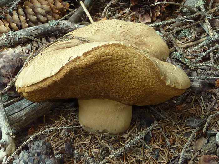 die Poren sind quittegelb,-der Hut eher gräulich,-Fleisch hell u.fest,-der Stiel auch auffällig gelb.