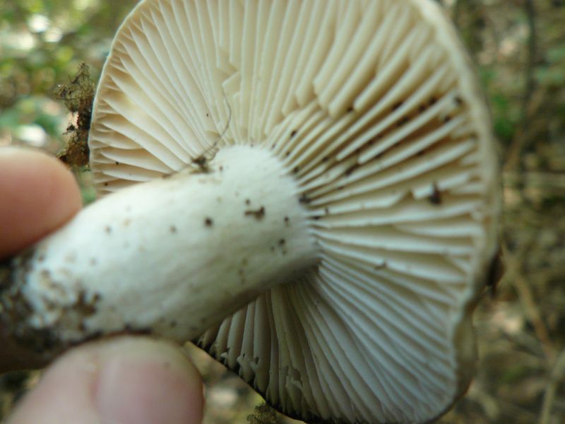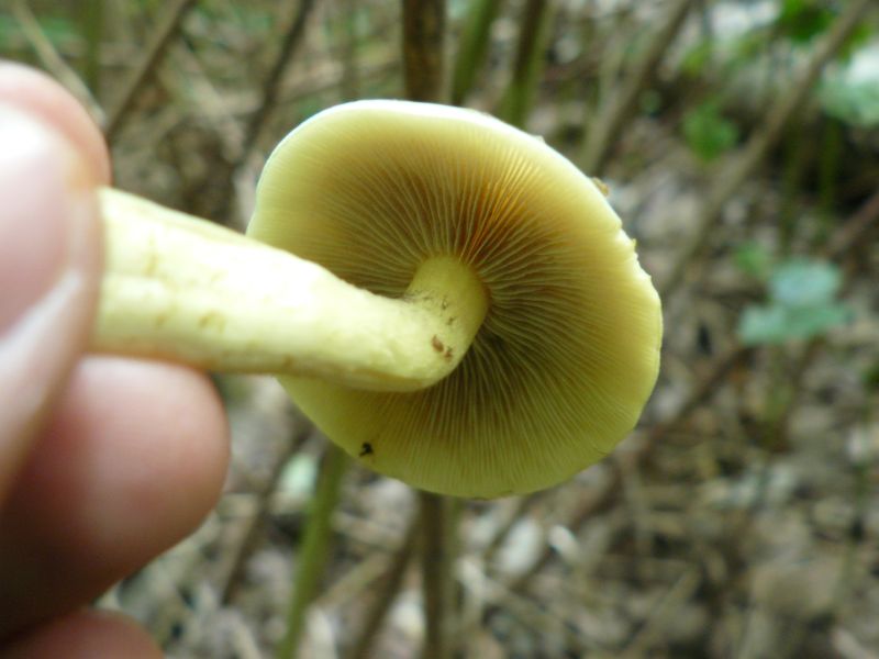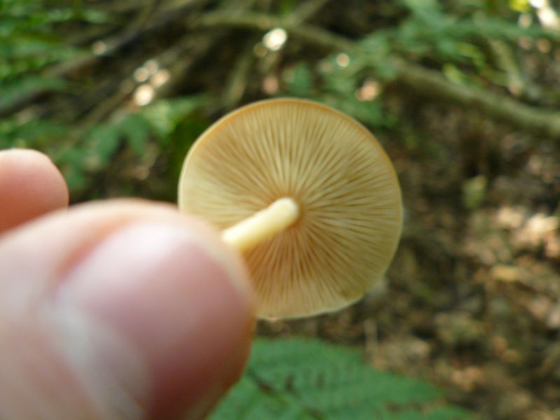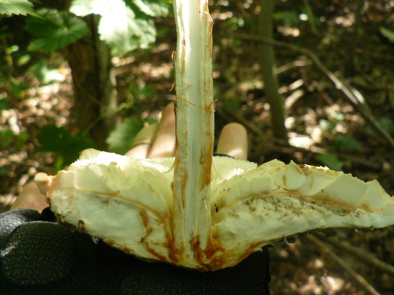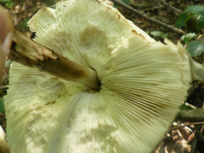 -weiß-gelblich Farbe von Hut, Stamm und Lamellen, wobei der Hut etwas dunkler ist