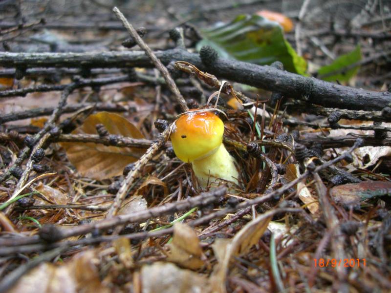 Vorbei an einer Gruppe Safranschirmlinge ging es in Richtung eines mit Lärchen bewachsenen Stückes. Erwartungsgemäß leuchteten uns schon von weitem die goldgelben Kappen der Lärchenröhrlinge entgegen. Ihre Anziehungskraft war für mich so groß, dass ich prompt an wahrhaft gigantischen Becherlingen vorbeilatschte, die man eigentlich nicht übersehen konnte. Ich kann so was, aber zum Glück pfiffen Björn und Melanie mich zurück.