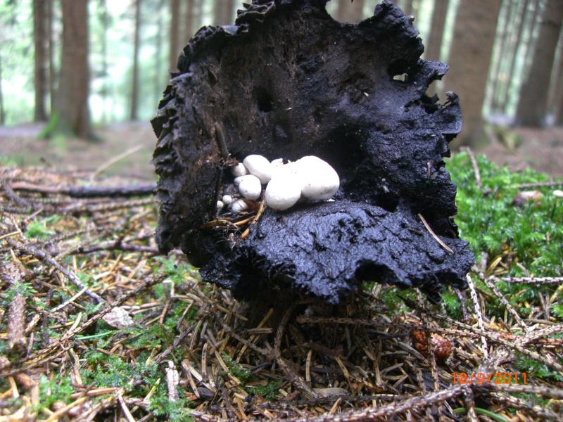 Melanie streifte etwas abseits und rief uns plötzlich zu sich. Sie hatte zwei dunkle, recht unscheinbare Pilze gefunden die Björn wieder mal faszinierten. Irgendwelche Wurzelrüblinge, und natürlich ist mir der Name wieder entfallen, aber wohl ziemlich selten.