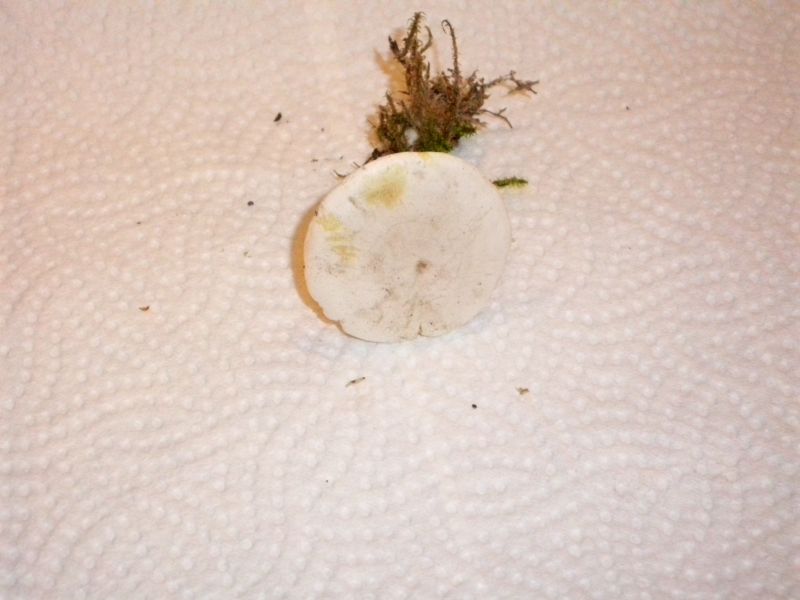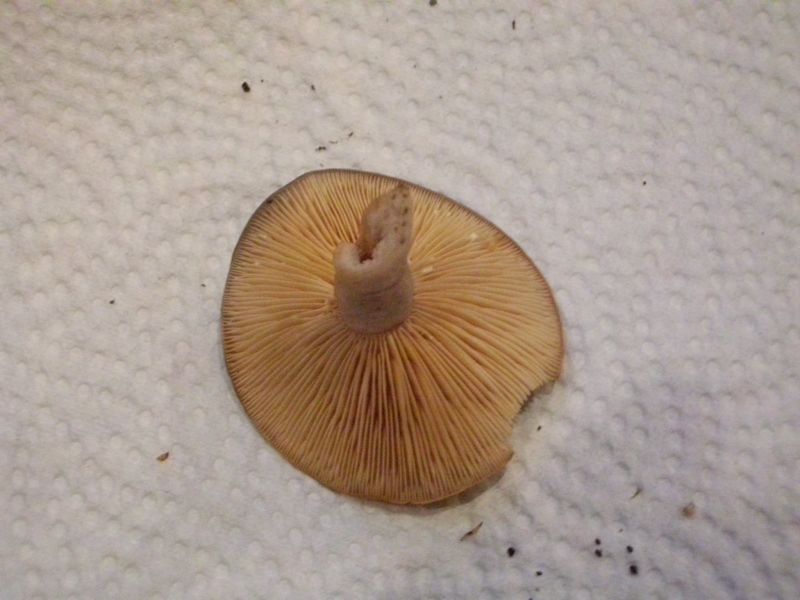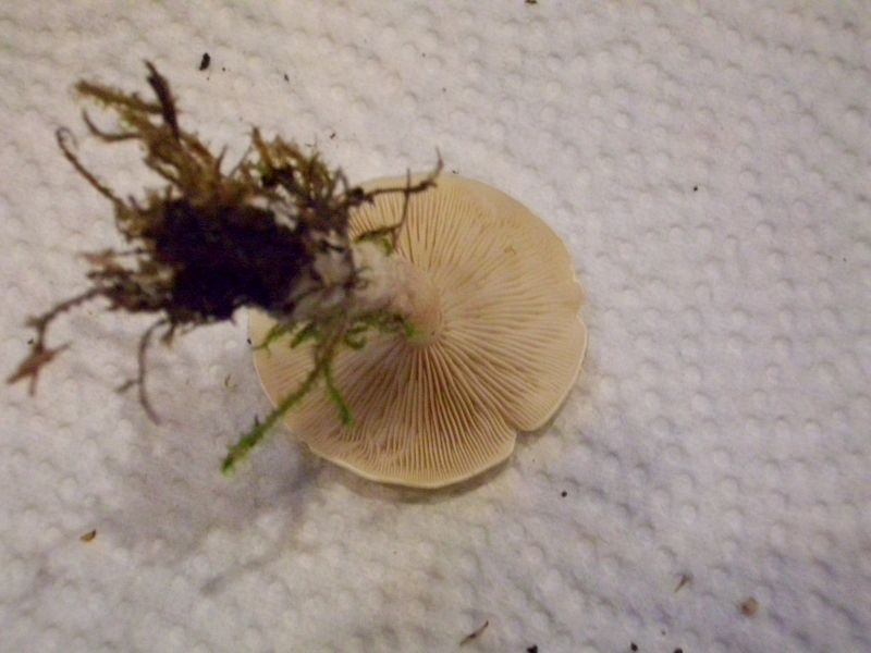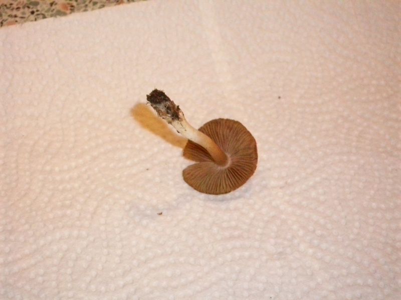 Ein kleiner weißer Trichterling, nehme ich an; welcher genau, vermag ich aber nicht zu sagen. Der Hut hatte einen Durchmesser von etwa 2,5 cm; der Stiel war etwa 3,5 cm lang. Gefunden im Vorgarten, ohne potenzielle Symbiosepartner. Der Geruch war pilzig.