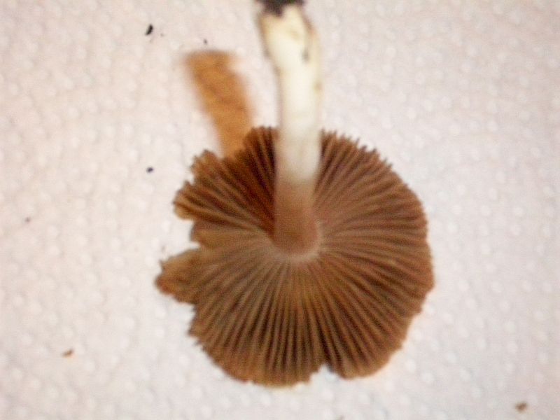 Vermutlich eine Risspilzart. Der größere der beiden Pilze hatte einen Hutdurchmesser von etwa 3,5 cm und einen etwa 4 cm langen Stiel. Das Foto der Lamellen des älteren Pilzes ist zwar leider unscharf, aber dennoch ist erkennbar, dass sie relativ weit auseinanderstehen. Der Geruch war pilzig mit leicht modriger Note. Gefunden ebenfalls in einem Vorgarten in einer großen Gruppe von etwa 15 Exemplaren.