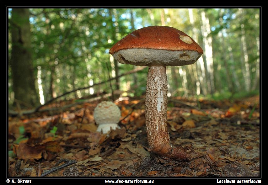 Eichen-Rotkappe (Leccinum aurantiacum) im Hintergrund ein junger Fruchtkörper des Fliegenpilzes (Amanita muscaria)
