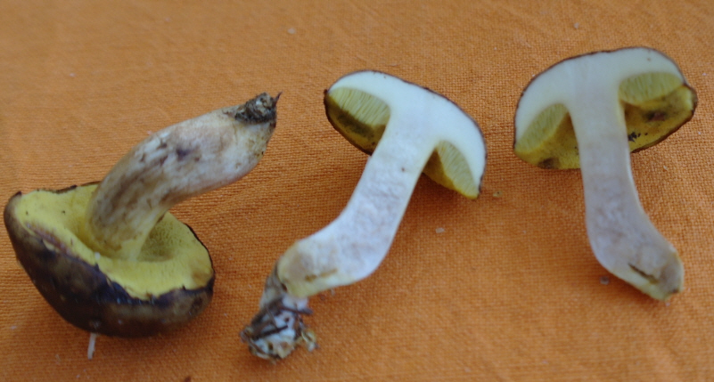 Steinpilz nein, Maronen ja, aber nur die Röhren.So ist es, das Blauen sehen wir übrigens auf dem ersten Foto, am rechten Fruchtkörper. Aufgrund der blassgelblichen Röhrenfarbe schließe ich eine Ziegenlippe aus. Die Fruchtkörper sehen aus wie Maronen, allerdings mit einer seltsam erscheinenden Stieloberfläche. Zwischen Ziegenlippe und Marone existieren weitere Filzröhrlinge, deren Artrang und genaue Position (Xerocomus, Xerocomellus) umstritten ist. Aus diesem Grund bin ich auch in diesem Jahr dabei, sämtliche Filzröhrlinge unters Mikro zu legen, um zu gucken, ob man mit den hiesigen Bestimmungsschlüsseln (siehe aktueller Tintling) überhaupt was anfangen kann und ob einzelne Arten überhaupt voneinander getrennt werden können.