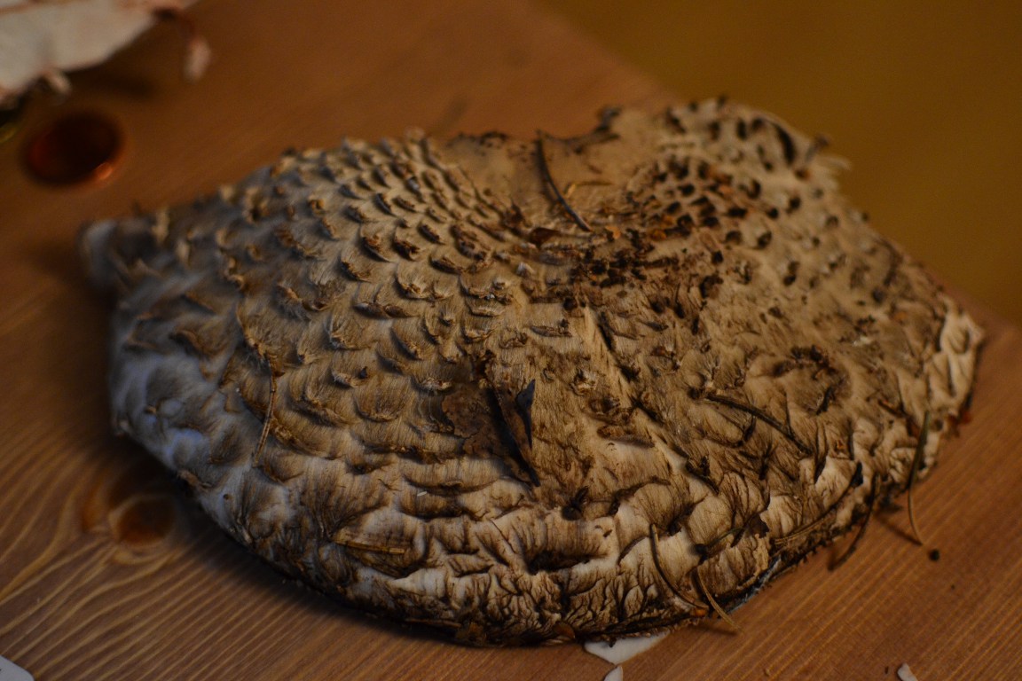 • Hallo, ein Parasol ist das nicht, da dieser nicht rötet. Ich tippe mal auf Safranschirmpilz. Ich finde auch öfter welche im Nadelwald. Die Abgrenzung zu Gartenschirmling bzw. zum Gift-Riesenschirmpilz (Macrolepiota venenata) fällt mir allerdings oft nicht leicht. Beim diesen sind die Schuppen dunkler und der Kontrast zu den nichtbeschuppten Stellen ist größer. Zur Hutmitte hin ist er deutlich dunkler. Der Stiel ist recht hell. Manchmal finde ich Safranschirmlinge (?), die mich durchaus zweifeln lassen. Bei den Fotos hier bin ich mir in Bezug auf den Safranschirmlinge aber ziemlich sicher, auch wenn der Stiel fehlt.