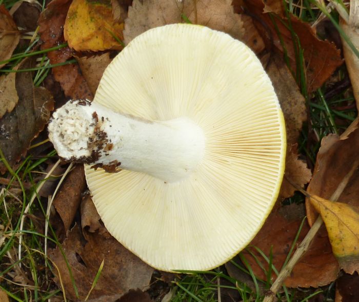 Neben einem Täubling mit dunkel weinroter Oberfläche, von dem ich leider nichts fotogenes finden konnte, habe ich noch diesen in einem kräftigen hellen Ockergelb gefunden: