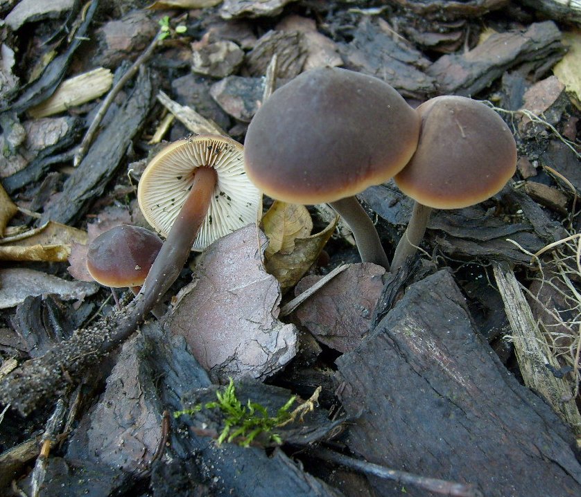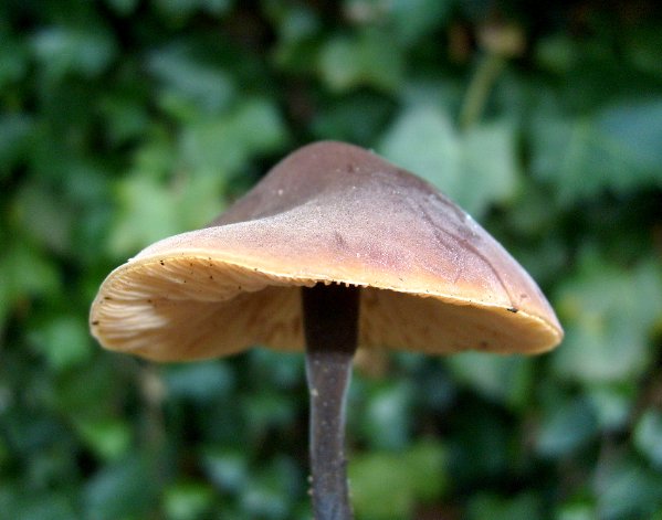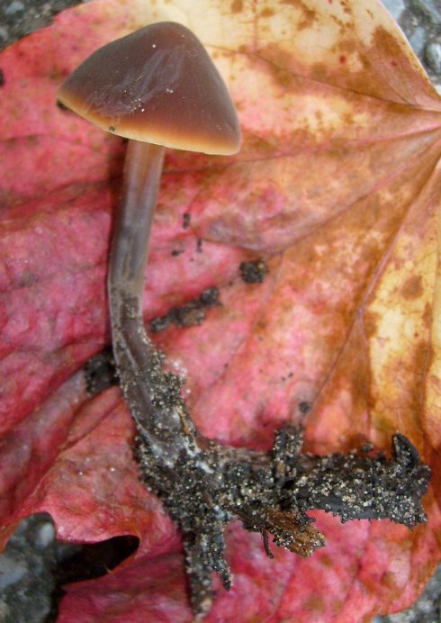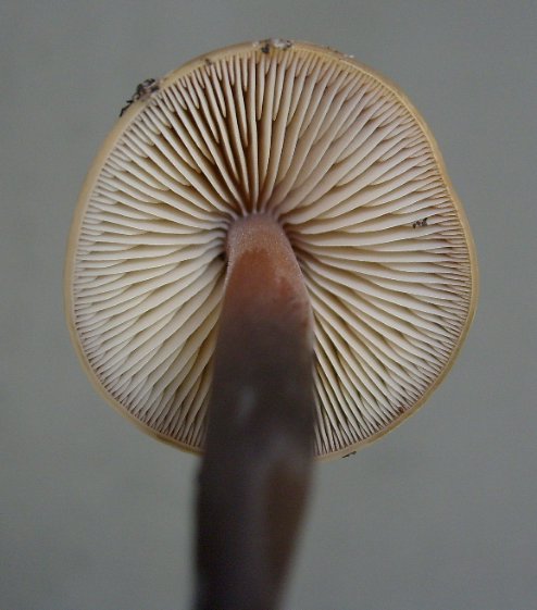 Der halbkugelige Hut ist dunkelbraun, am Rand gelblich gesäumt, schlanker, schwarzer Stil, verbogene Wurzel, Lamellen weiß.