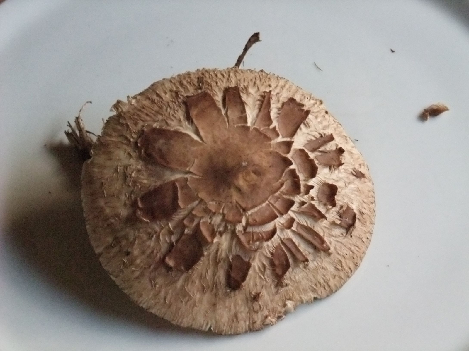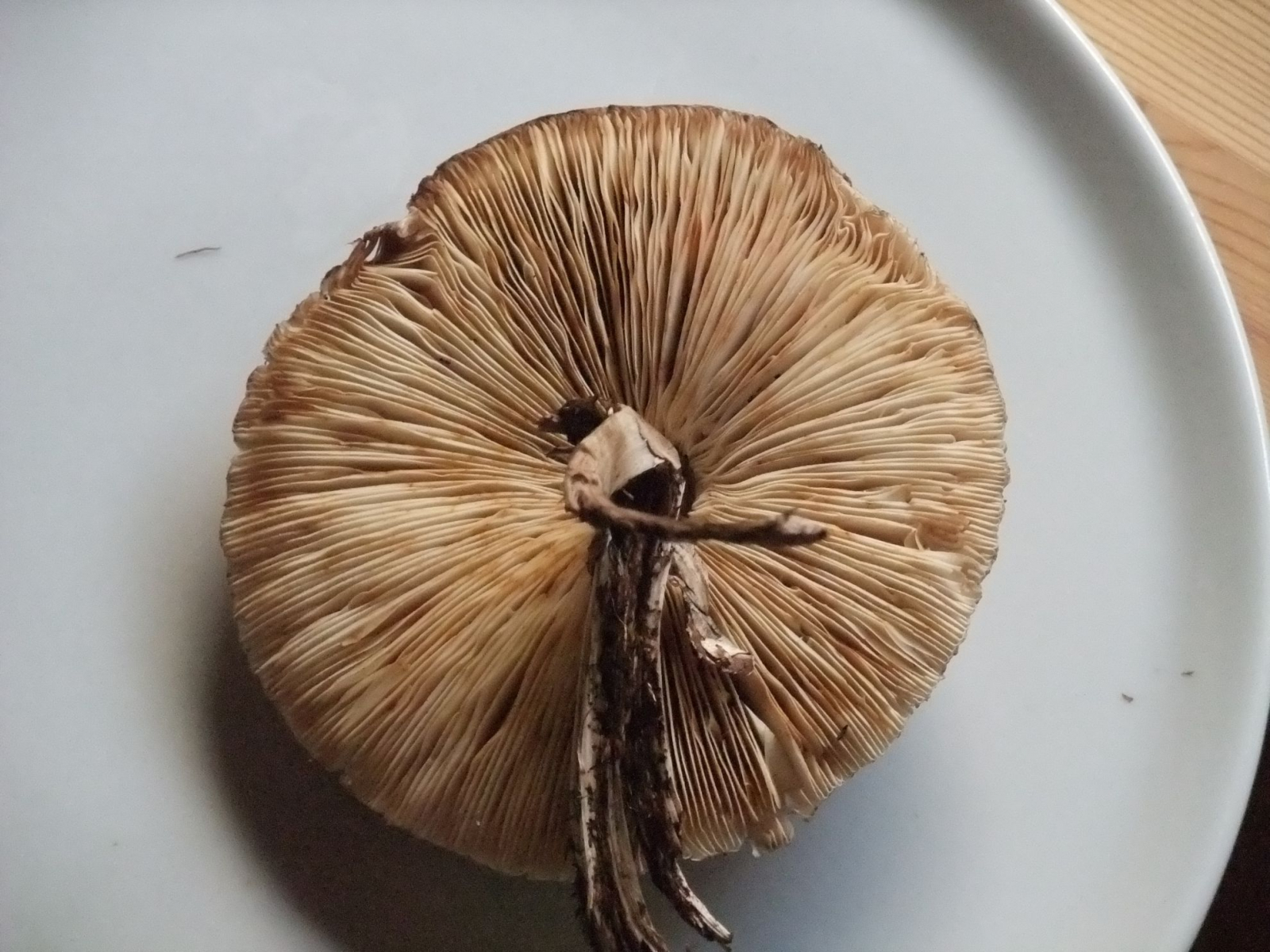 Und zwar: Es ist ein Riesen-Schirmling (Macrolepiota) und so, wie die Hutoberfläche strukturiert ist, sehr wahrscheinlich KEIN Parasol, sondern einer von den kleineren Riesen-Schirmlingen. Ich tippe hier mal auf Macrolepiota fuliginosa, dazu müsste man wissen, ob er rötet. Kann man hier auch wahrscheinlich nicht mehr feststellen.