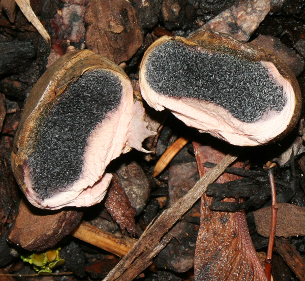 Eine Wurzeltrüffelart (Rhizopogon) wage ich übrigens auszuschließen, da diese keine aufplatzenden Peridie ("...Alle schienen oben wie "aufgeplatzt" zu sein...") besitzen und eine andere Ökologie bevorzugen (Naldelwald, Kiefern, sandige Böden). Die Bunte Schleimtrüffel (Melanogaster variegatus) kann zwar in Gärten vorkommen, scheidet aber auf Grund des Schnittbildes für mich aus.