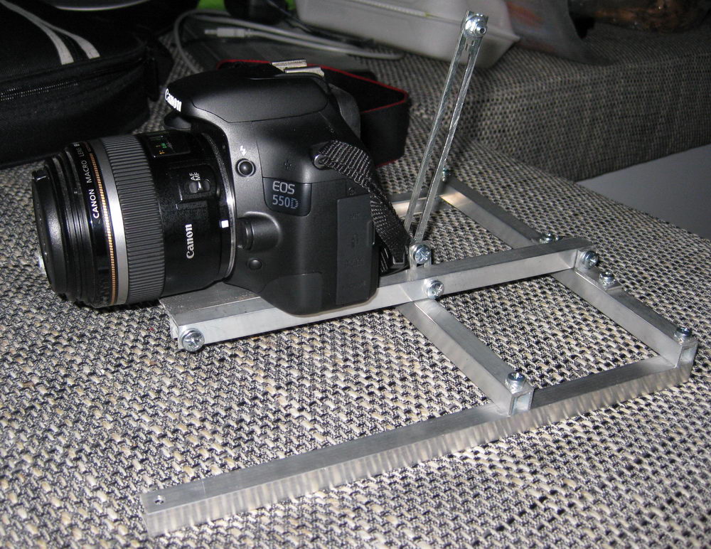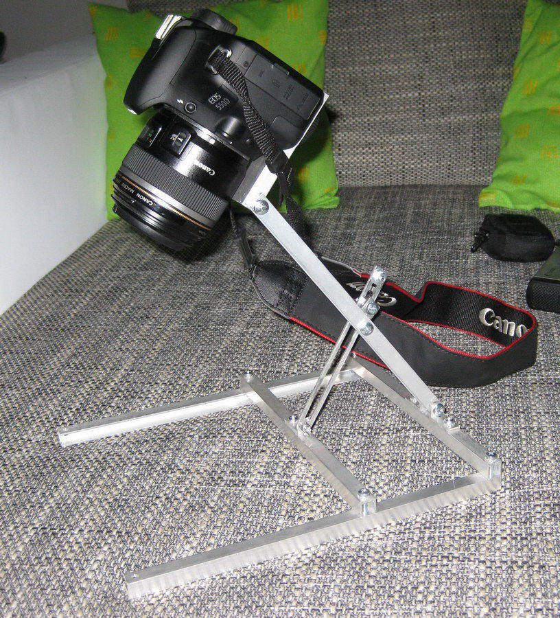 Belichtungen während die Kamera vom Rucksack rutscht, sind manchmal zwar künstlerisch anmutend, zur dokumentarischen Pilzfotografie aber nur bedingt geeignet. Ein Bohnensack, oder in meinem Fall ein Erbsensack bietet den Vorteil die Kamera stabil und schwingungsfrei zu lagern. Doch der Nachteil dabei ist, genau wie beim Rucksack, der Neigungswinkel der Kamera. Während ein Bohnensack meist eh nicht hoch genug ist, um einen Pilz z. B. im 45 °-Winkel abzulichten, hat zwar ein Rucksack die richtige Höhe, doch rutscht die Kamera irgendwann einfach kopfüber nach vorne. Die Stative, die ich gefunden habe, gingen entweder nicht weit genug nach unten oder waren einfach schweineteuer. Also habe ich mich am Wochenende mal hingesetzt und gebastelt. Ziel war es ein Stativ zu basteln, das Aufnahmen von der Maus- na gut, doch wohl eher Rattenperspektive bis fast senkrecht von oben ermöglichen sollte. Heraus kam dann das: