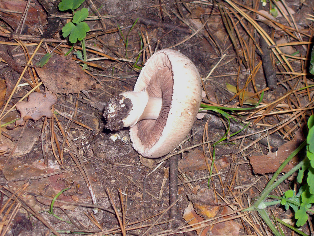 Würde ich nach reiflicher Überlegung für einen Agaricus-Vertreter halten können, Schnitt durch den (ganz leicht keuligen) Fuß zeigte keinerlei Gelb, er roch gut. Noch rieselt der Sporenabdruck und die Spuren im Stiel lassen auf Bewohner schließen, morgen genaueres.