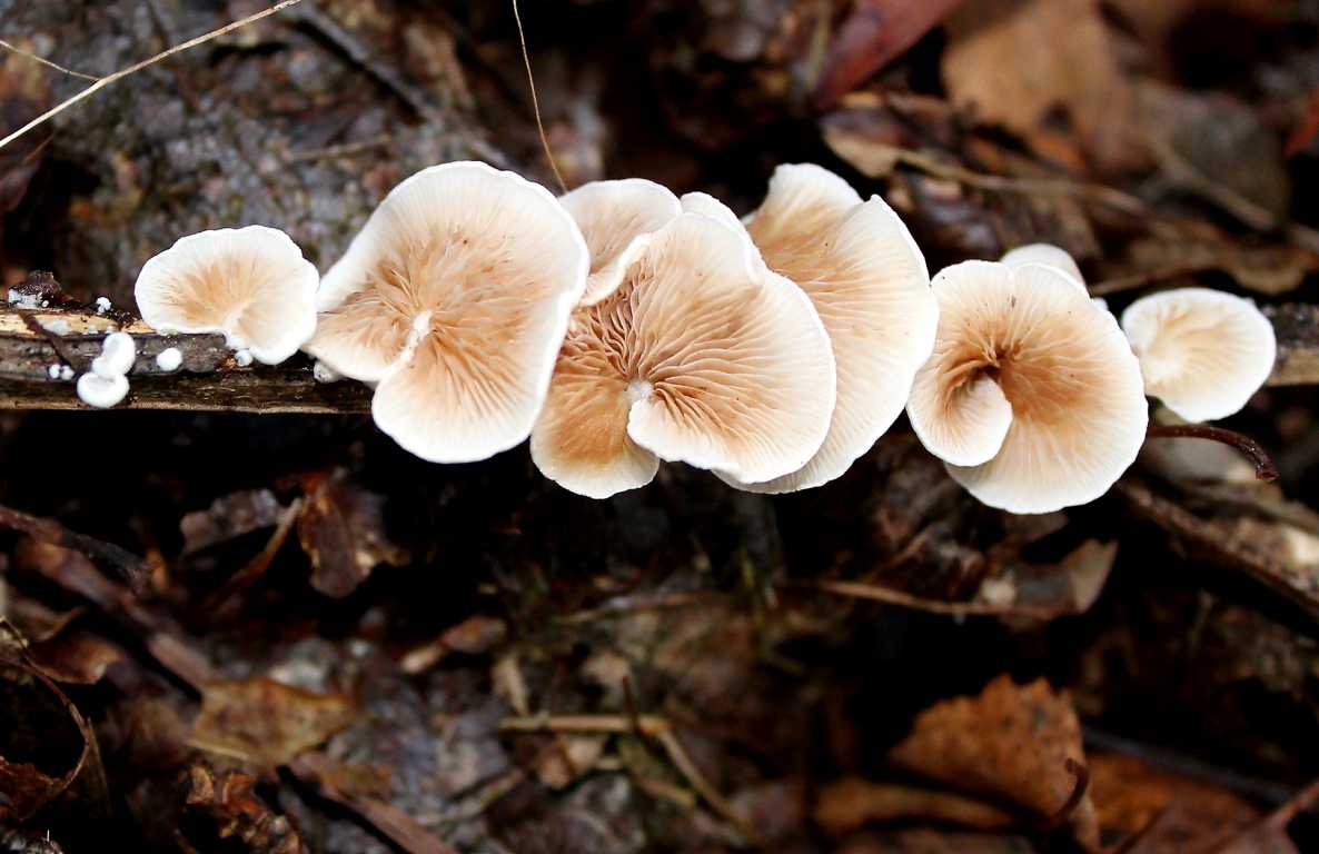 das mit den Stummelfüßchen (Crepidotus spec.) sehe ich ähnlich, bei den größeren Pilzchen ist die braune Farbe des Sporenpulvers recht gut erkennbar. Junge Pilzchen haben ganz weisse Lamellen, die sich erst später langsam verfärben.