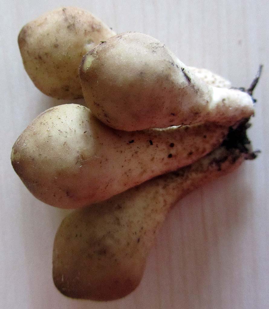 Die Pilze sind alle zusammen gewachsen an der Wurzel der längste ist 5 cm hoch und hat einen maximal Durchmesser von 2 cm.