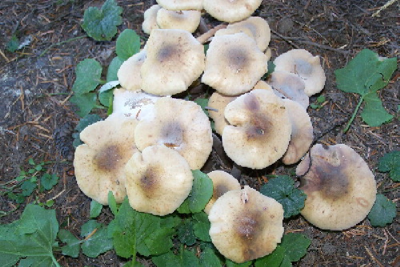 Was die Bestimmung des Pilzes angeht, bin ich mir nicht ganz sicher. Jedenfalls scheint es sich um ältere Fruchtkörper zu handeln, die in Form und Farbe schon etwas gelitten haben. Ich meine, sparrige Schüppchen auf dem Hut zu erkennen und würde an den Hallimasch oder auch den Sparrigen Schüppling (an letzteren v.a., wenn das Braune an der Hutunterseite Sporenpulver und nicht Fäule ist) denken.