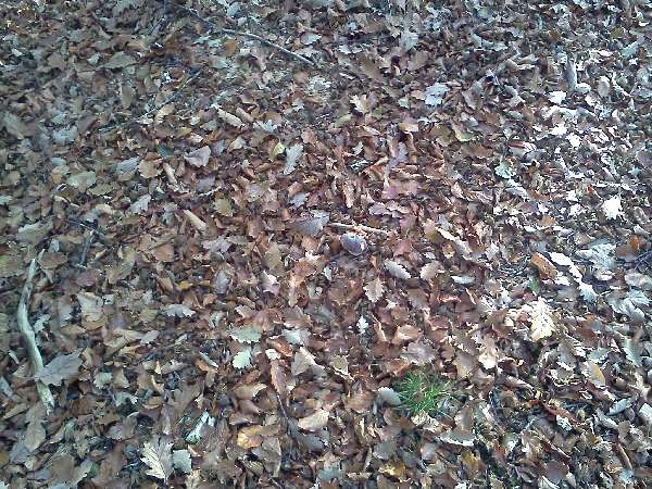 Bild 1: Eichenblätter (Quercus spec. in Herbstfärbung) Buchen oder Hainbuchenblätter ( Fagus spec.oder Carpinus betulus in Herbstfärbung) und irgendwo in der Mitte ein Pilz.... wenn man genau hinsieht...