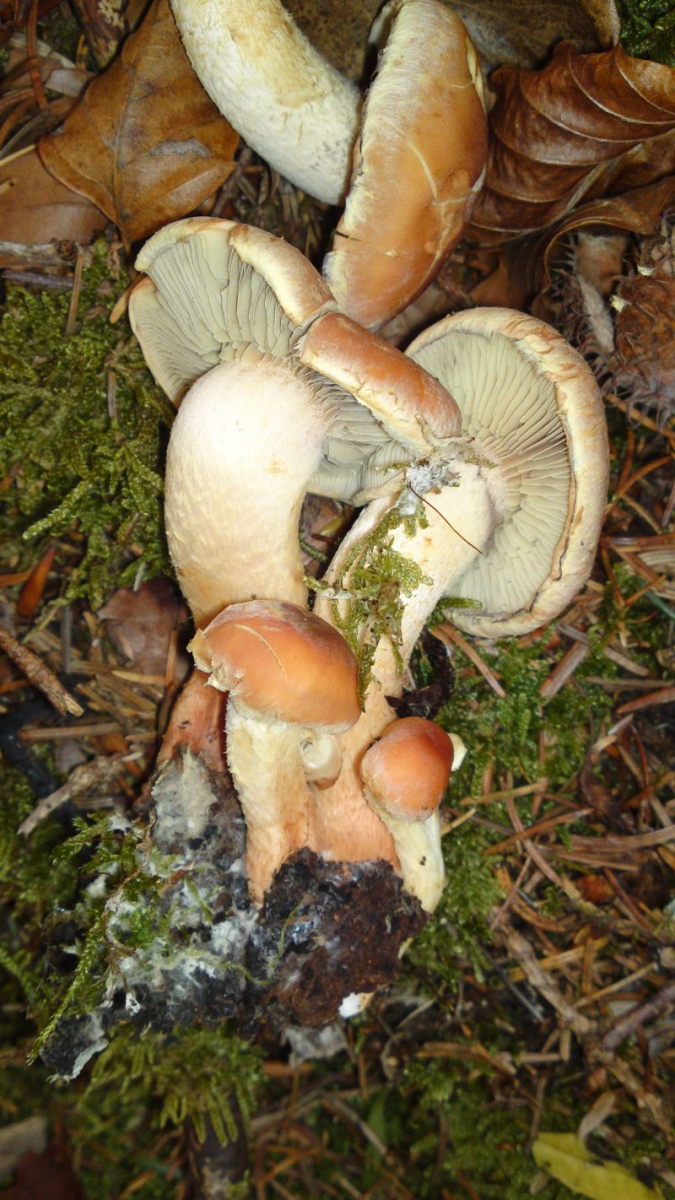 Auf vermoderndem Fichtenstumpf, sehr gesellig (ca. 50 Exemplare), Hutdurchmesser bis ca. 5 cm, max. 7cm groß, Hut samtig braun, Lamellen olivgrün, Geruch eher schwach unangenehm.