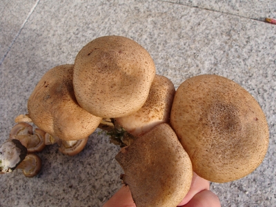 Lamellen, weißes Fleisch, bräunlicher Hut mit dunkleren Punkten (wie Flaum) und ist verdächtig oft in Bündeln auftretend. Höhe max 10cm.