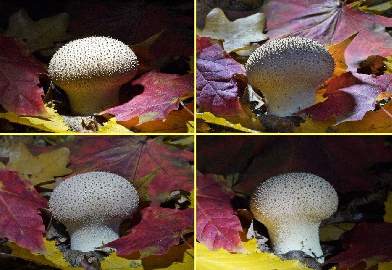 • Es gibt Pilze, an denen komme ich nicht vorbei, ohne mich an ihrem Anblick zu erfreuen. Dazu gehört der Flaschenstäubling Lycoperdon perlatum. Gestern habe ich einen im Schein meiner Stirnlampe abgelichtet. Ein paar der Aufnahmen möchte ich euch nicht vorenthalten.