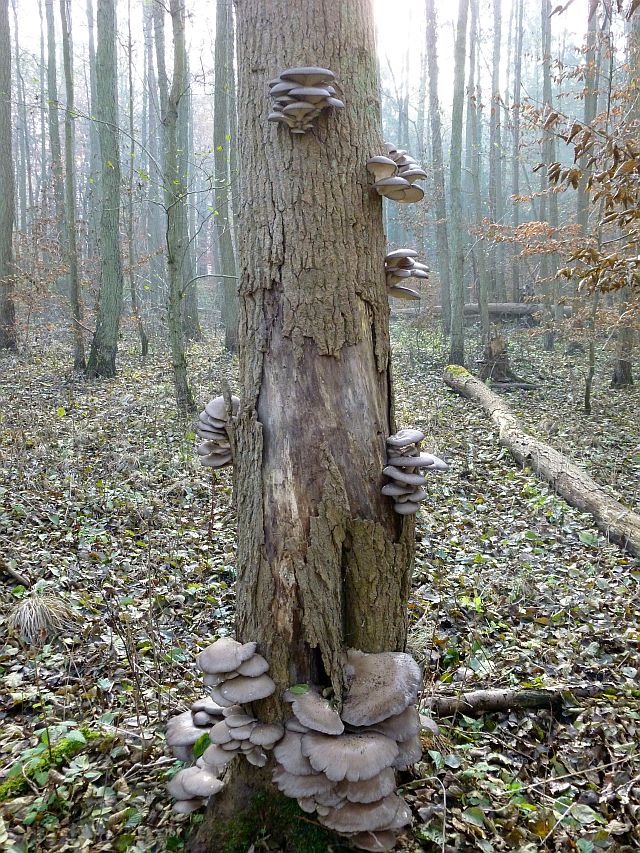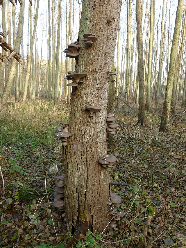 Ich habe mich nach anderen Bäumchen umgeschaut und wurde auch fündig: Ein alter Baum (vermutlich Erle oder Pappel) war recht gut bestückt mit den kulinarischen Köstlichkeiten. Der kleinste Fruchtkörper war wie ein Centstück und der größte Tellerform (zwei Handflächen lang). Hier ein paar Bilder: