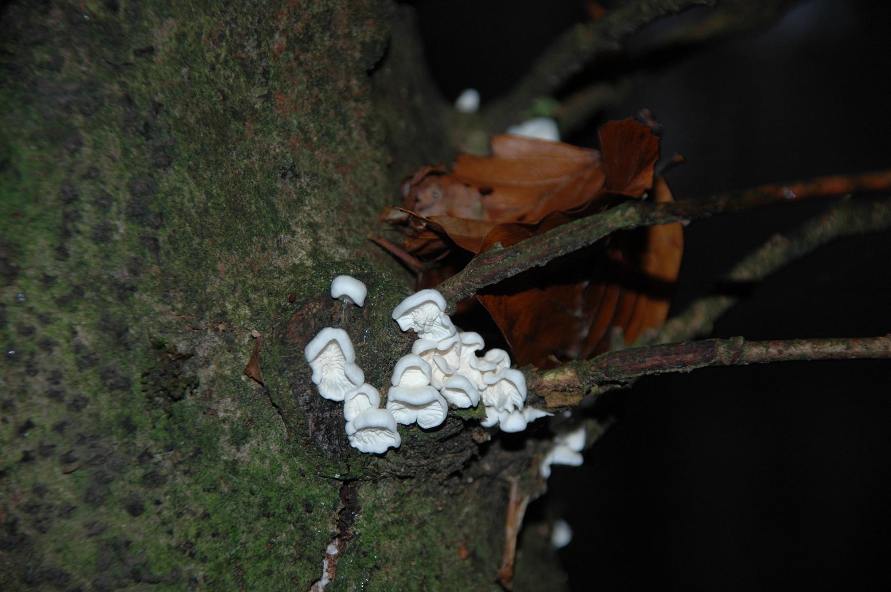 Ich tippe mal auf Plicatura crispa, den Buchen-Aderzähling. Es wäre gut, Fotos von oben zu bekommen - und natürlich von unten aus größerer Nähe.Gr Dryocopus