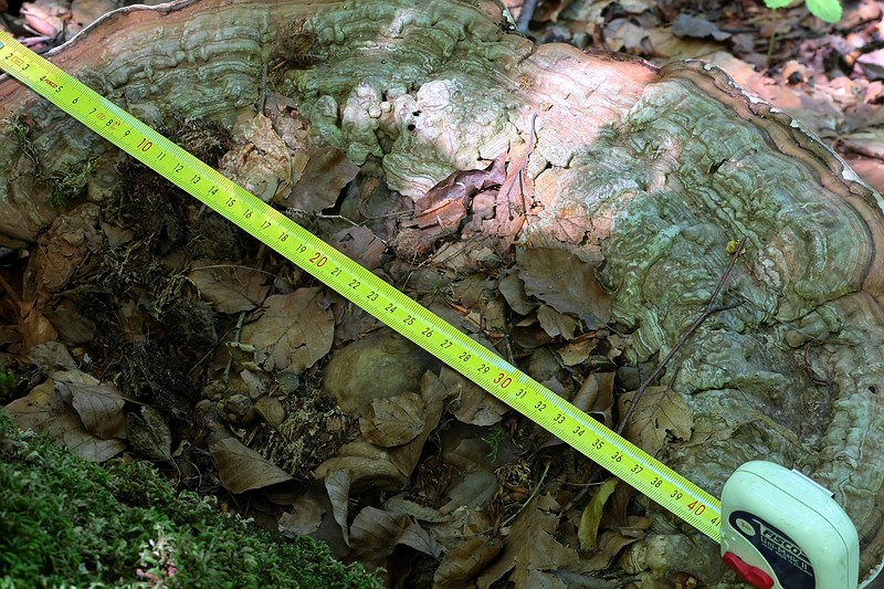 Vor fast zwei Jahren habe ich ebenfalls an Buche ein Exemplar gefunden, das eine Gesamtbreite von 77 cm aufwies. Es bestand aus insgesamt drei zusammengewachsenen Fruchtkörpern, der rechte davon war genau 50 cm breit: