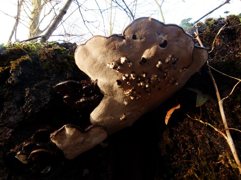 Die Unterseite zeigt deutlich die Zitzengallen, die von der Zitzengallenfliege Agathomyia hervorgerufen werden. Viele Exemplare von Ganoderma lipsiense sind davon befallen.