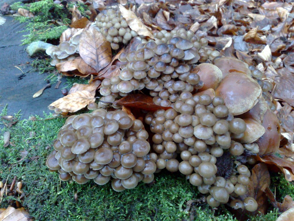 auf Bild 3 müßten Ziegelrote Schwefelköpfe (Hypholoma lateritium syn. Hypholoma sublateritium) sein aber auch ganz junge Rauchblättrige Schwefelköpfe (Hypholoma capnoides) haben manchmal solch eine rötliche Färbung.