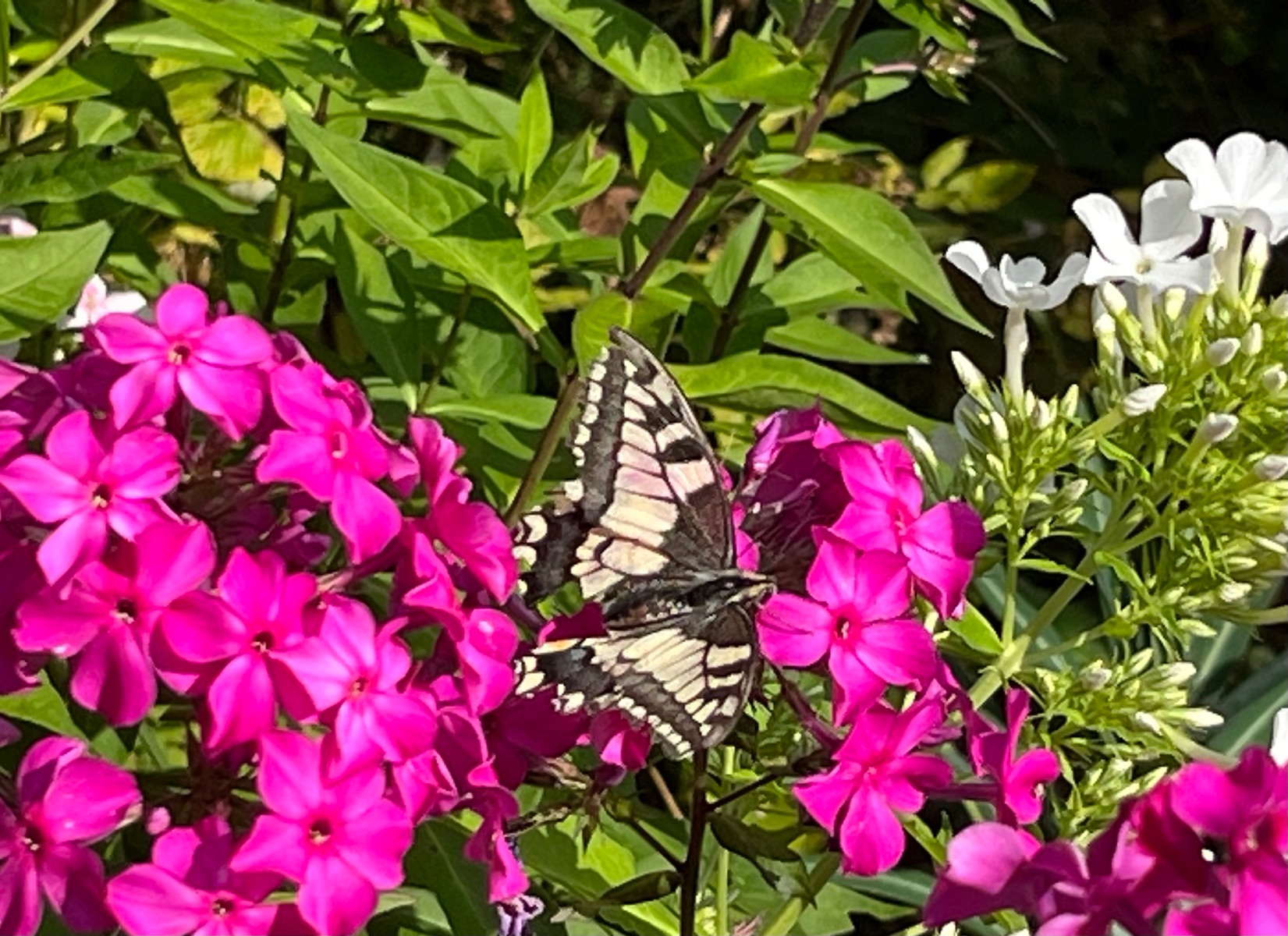 Die Ampeln an der Terrasse stehen in voller Blüte und sind zu meinem Erstaunen dieses Jahr von der „Weißen Fliege“ bisher verschont worden...