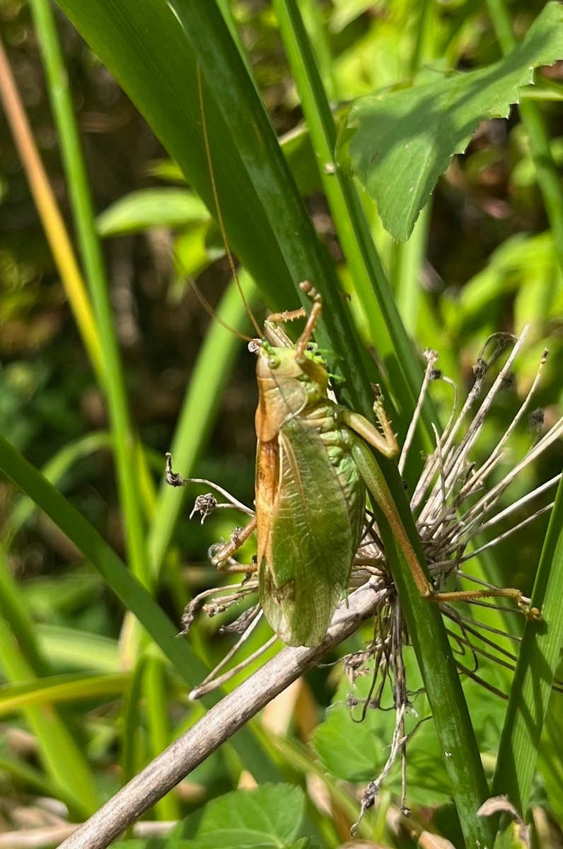 An jedem Entwässerungsgraben im Ried finden sich zahlreiche Netze mit darin verpackten Heuschrecken und leider auch erbeuteten Libellen.