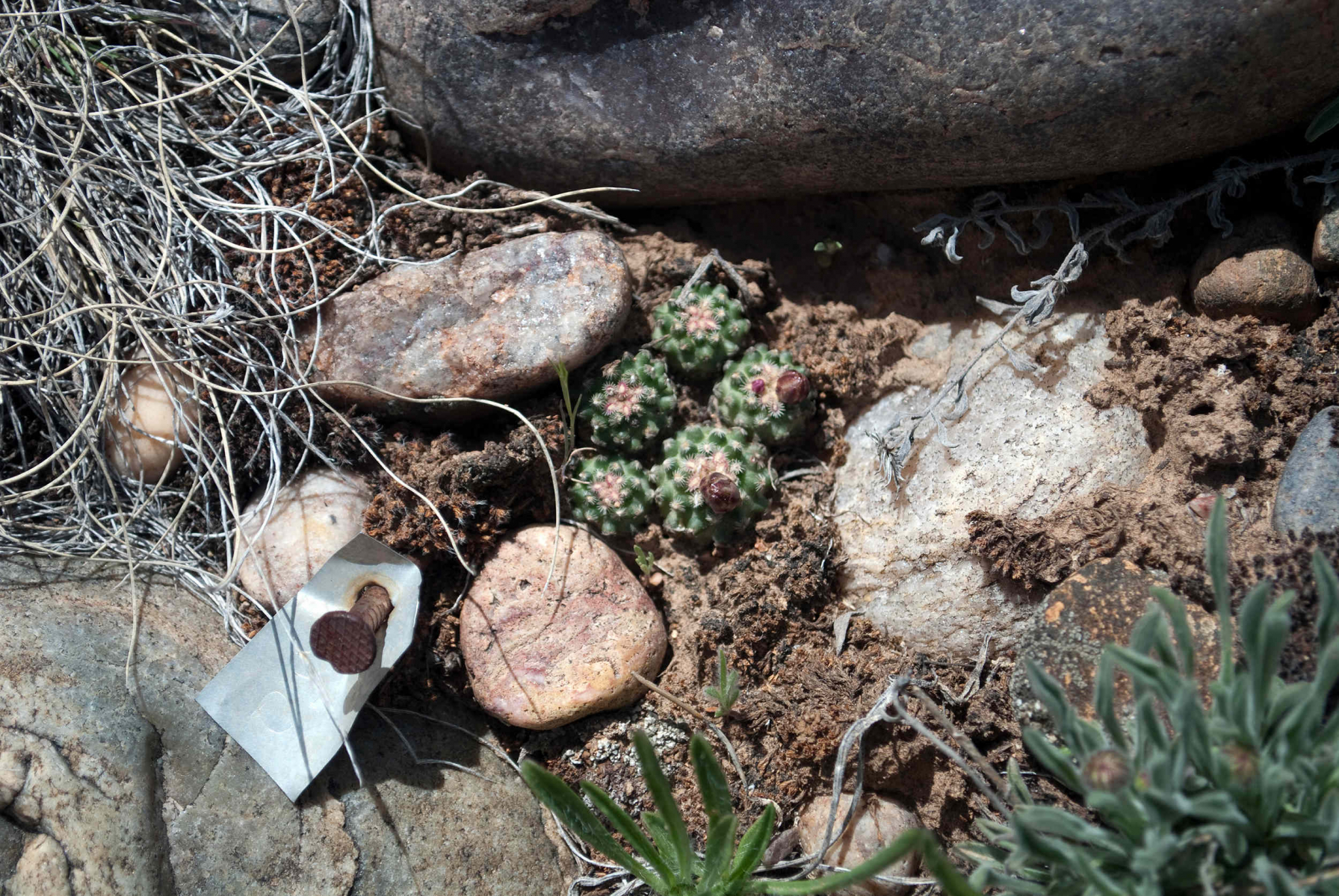 Wie andere hoch seltenen Kakteen auch, werden diese Winzlinge überwacht. Und deswegen hat jede Pflanze oder Gruppe eine Alumarke mit einer Nummer drauf. Es wird überwacht wie die Pflanzen sich entwickeln, ob sie Blüten & Früchte tragen, etc. Diese Pflanzen sind extrem bedroht.
