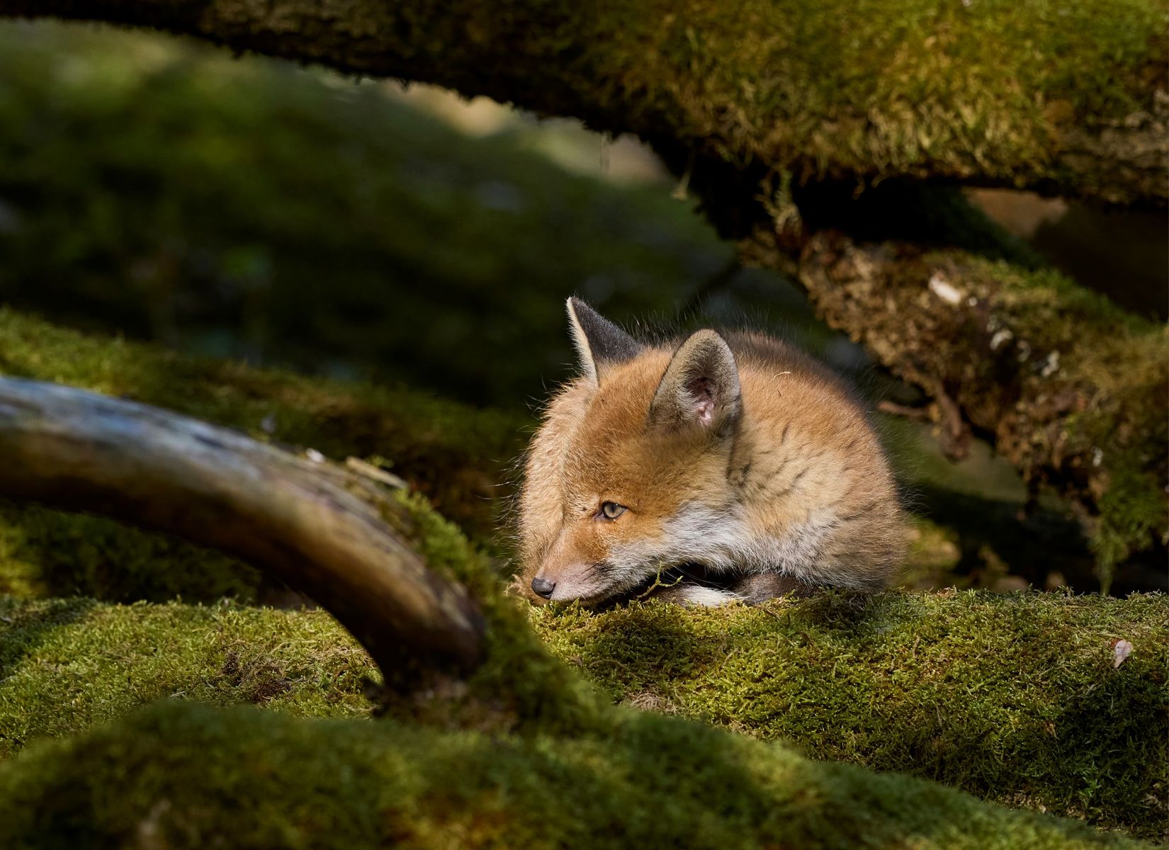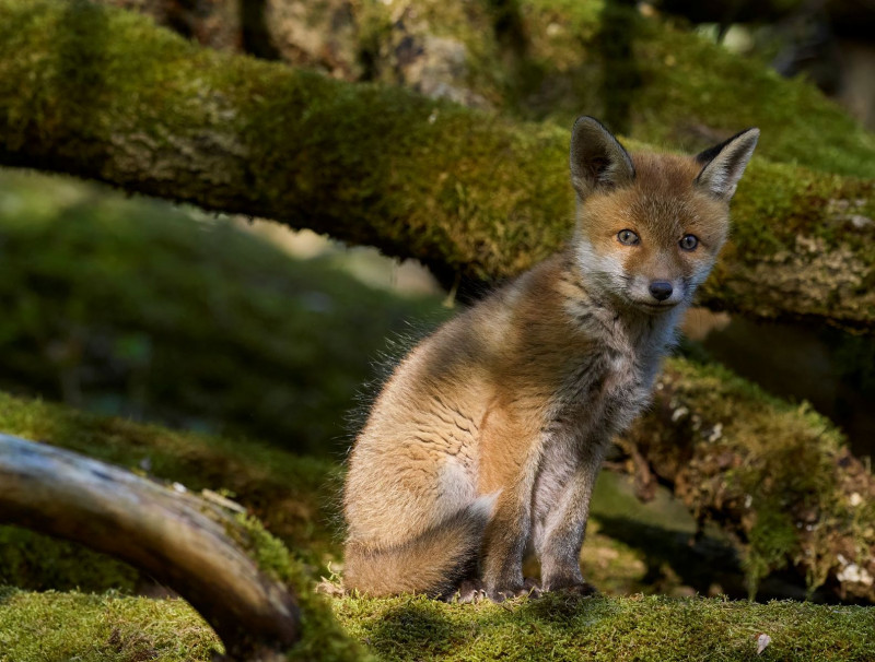 • Gestern hatte ich das Glück, in einer der Erosionsschluchten nahe meines Heimtortes mal wieder einen "befahrenen" (Jäger-Deutsch) Fuchsbau mit mehreren Zugängen zu entdecken. In der Folge eines Sturmes sind dort alte Spitzahorne kreuz und quer übereinander gestürzt; Wurzelteller tun das ihrige zur "Abriegelung" des Areals. Das Chaos wird durch die Stadtverwaltung belassen, dies freut die Füchse und auch mich. Die verrottenden Bäume sind zwischenzeitlich stark bemoost. Nach Sichtung die Situation wählte ich heute morgen eine Stelle aust, über die ich Fuchsjunge schon laufen sah. Da ich weiß, dass die Jungen morgens gerne ein Sonnenbad nehmen, setzte ich mich 6-7 Meter gegenüber auf einen liegenden Baumstamm und verharrte mit der Kamera im Anschlag. Meine Geduld wurde schließlich belohnt.