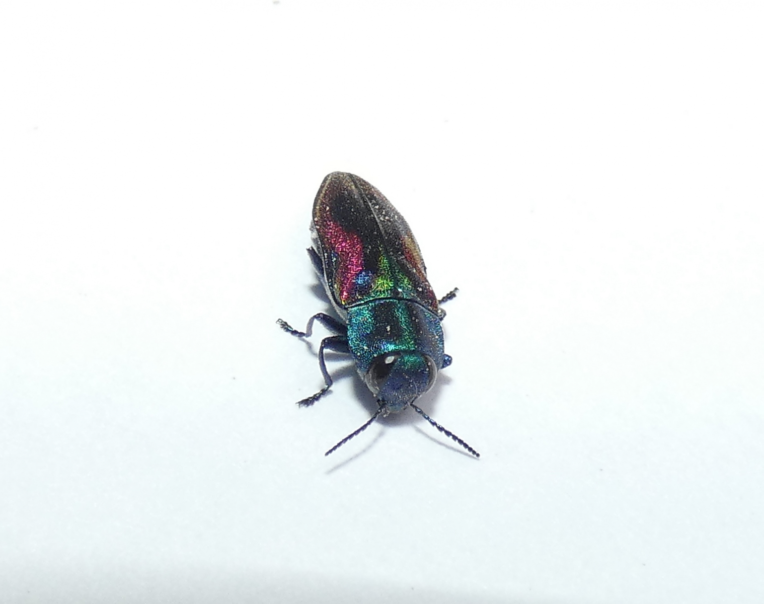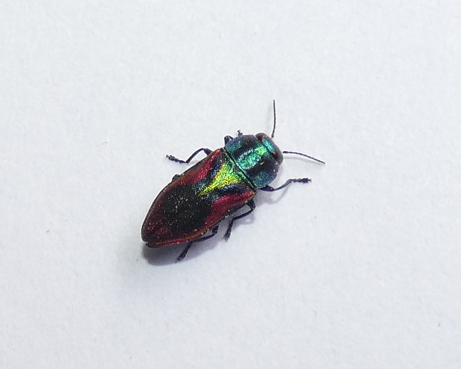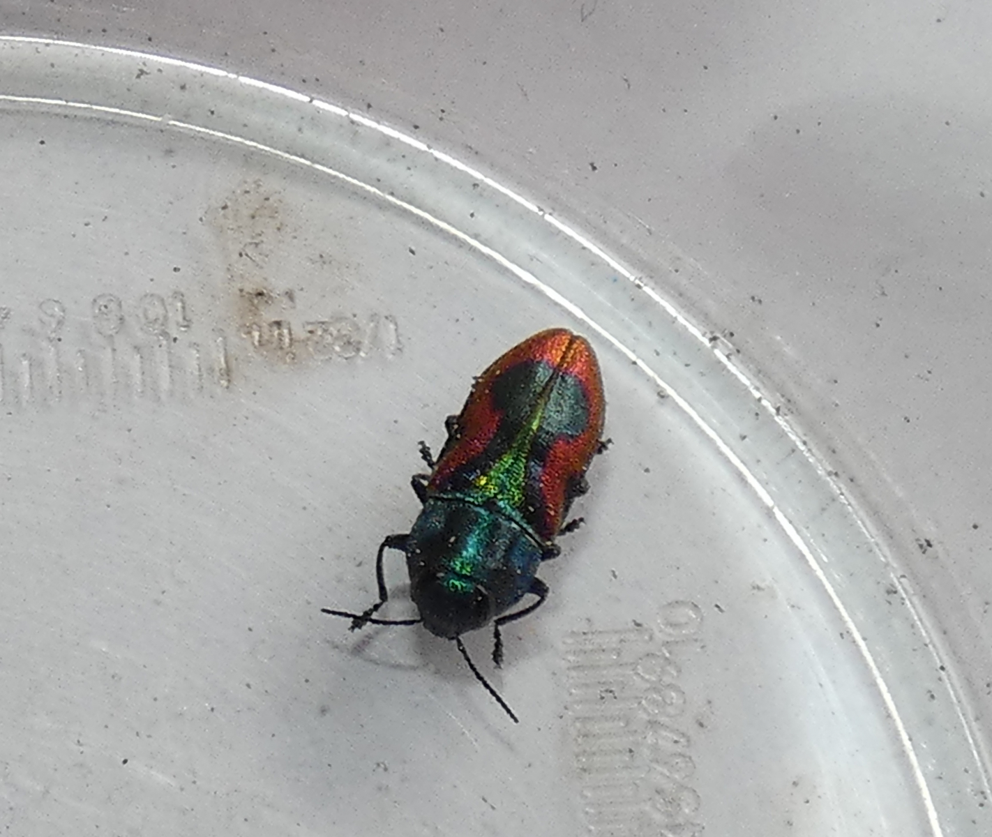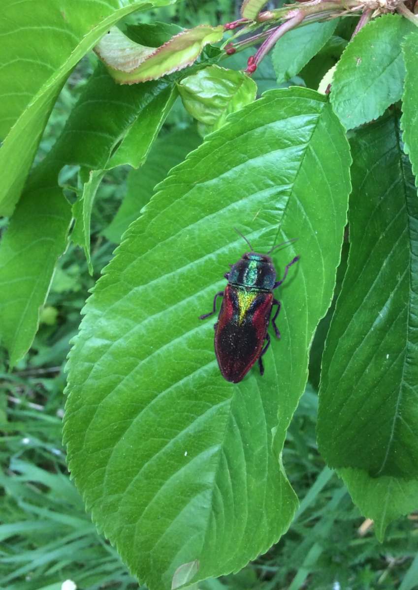 Das ist mir, glaube ich, auch gelungen. Ich kam zum Ergebnis Kirschprachtkäfer oder Bunter Kirschbaumprachtkäfer (Anthaxia candens). Kirschprachtkäfer – Wikipedia