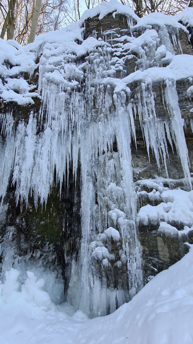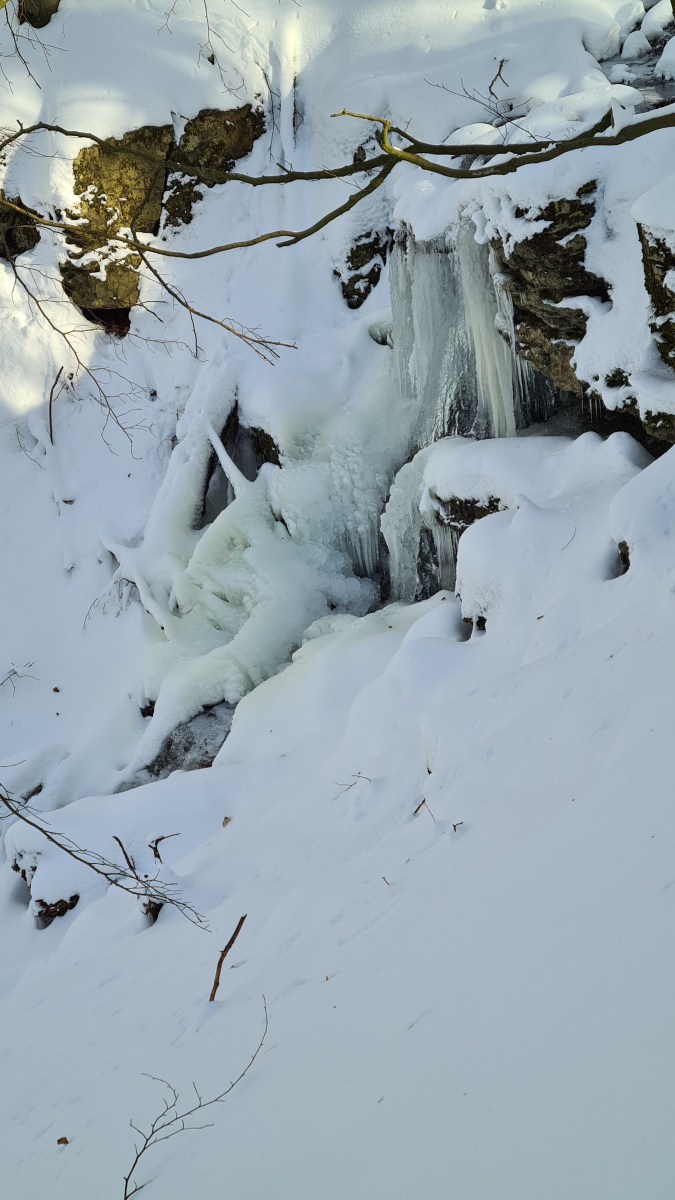 Und am Sonntag war ich im Hohenstein im Süntel, die Aussicht über das Weserbergland war wunderschön. Und danach hab ich noch "meinen" Wasserfall besucht, der zu Eis erstarrt war. Notiz an mich: wenn es seit einer Woche keinen Neuschnee gab und der Weg nach oben zum zweiten Wasserfall unberührt ist - abgesehen von Wildwechseln - dann hat das meist gute Gründe! Aber auch hier hat sich der Weg gelohnt..