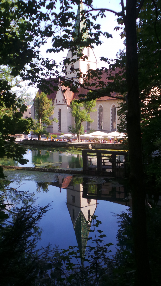 Hier die Kirche und die Mühle aus Radelfungus' Winterbildern in der Spätsommersonne mit dem Blautopf davor.