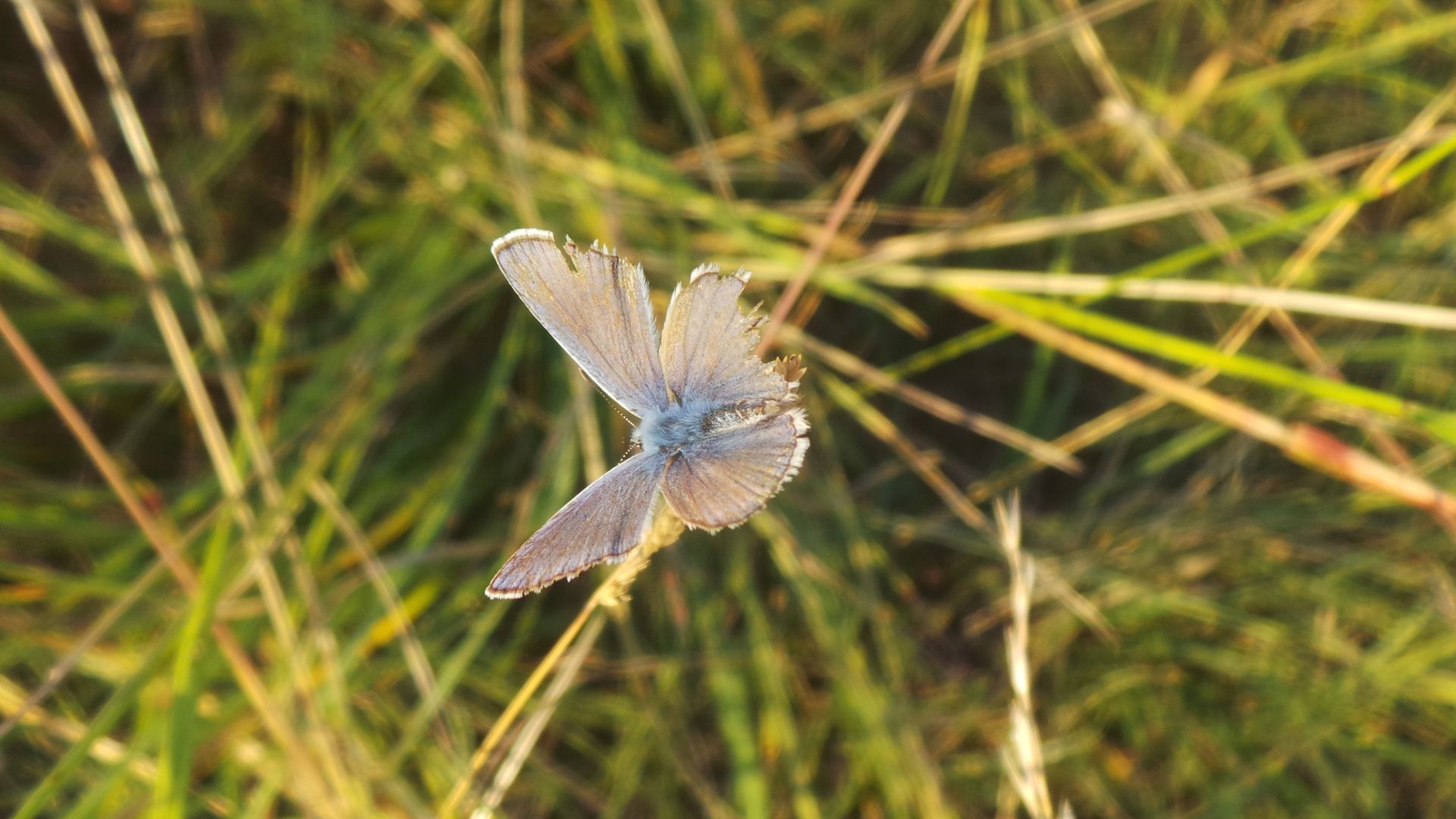 Nachtrag: Das ist der schon etwas abgehalterte Bläuling von rechts unten mit Blick auf die Flügeloberseite: