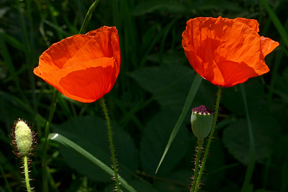 08 Mohn-Mohn-Mohn-Mohn, wie Hühner auf der Stange, von der Sonne "selektiv" beschienen (das Bild hätte noch weitere Versuche nötig gehabt, aber dann war die Sonne weg, der Wind kam dazu ...)