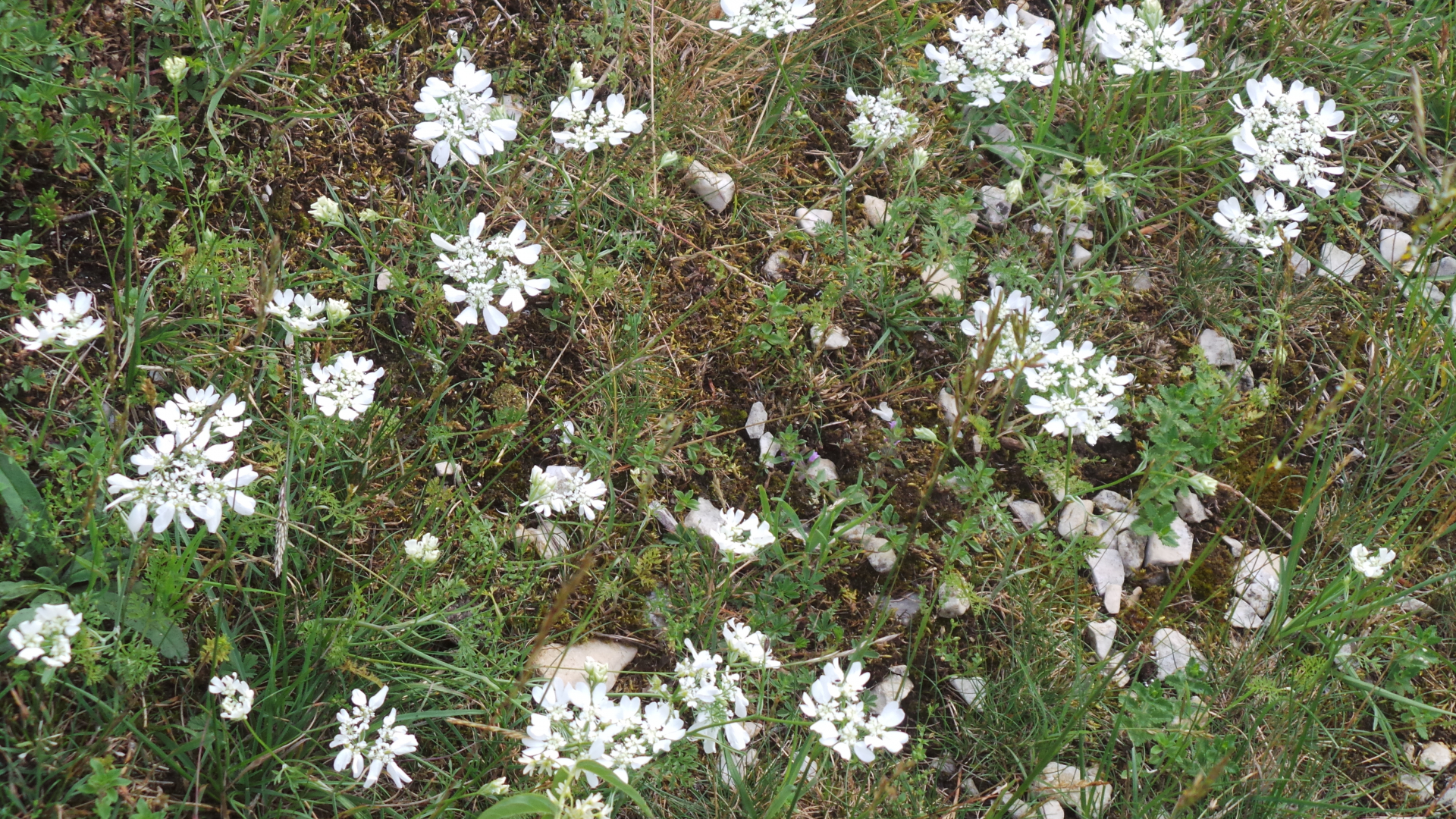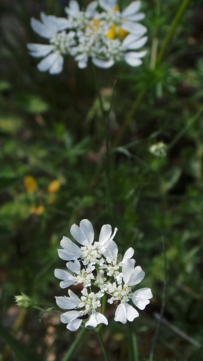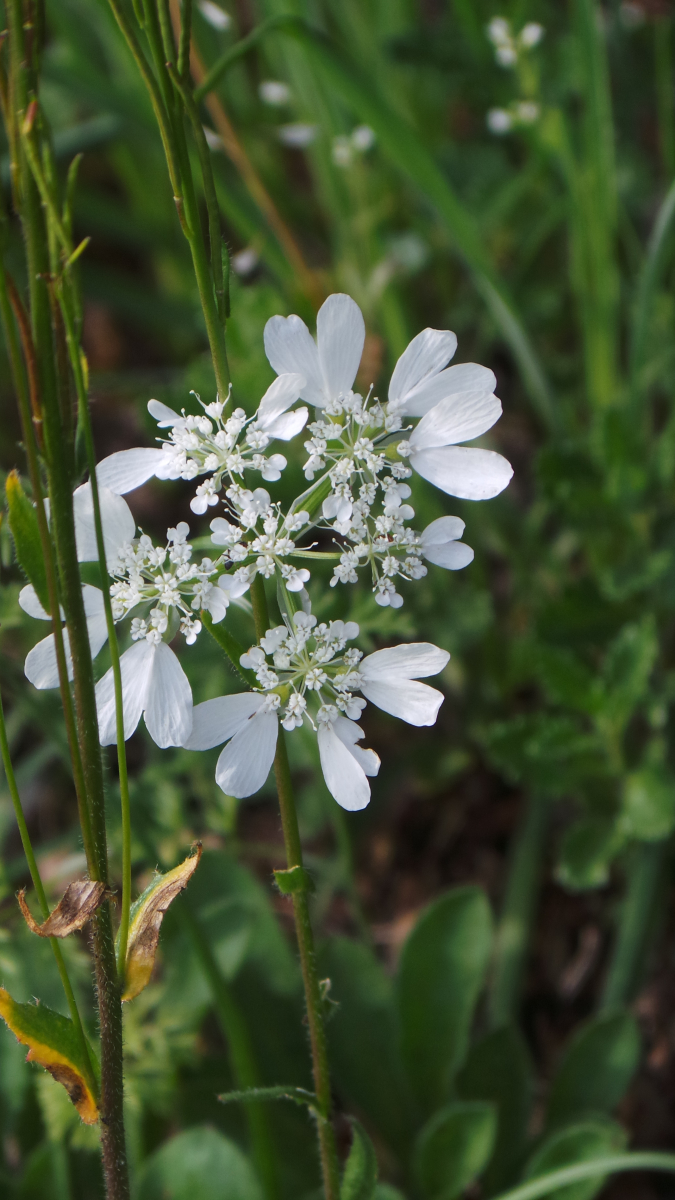 Edit: es sieht zwar ein bißchen ähnlich aus, aber meinen Fund würde ich eher irgendwo in die Verwandtschaft der Schleifenblumen (Iberis) stellen. Also nicht Doldenblütler wie die Orlaya, sondern Kreuzblütler. Weiß jemand, was das sein könnte? Leider sind mir die Fotos nicht scharf geworden.