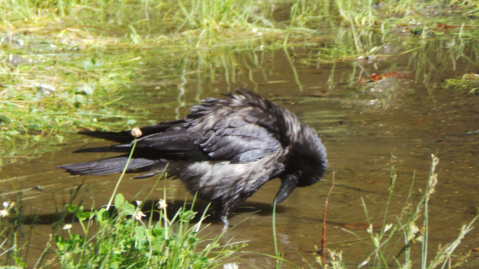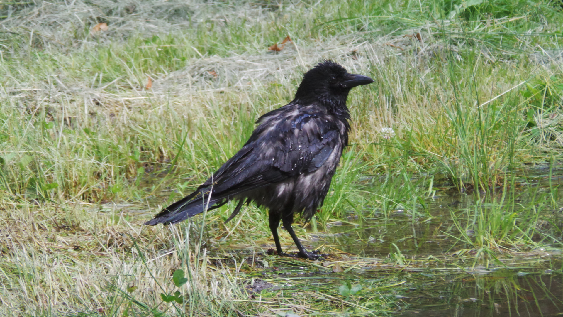 • Wenn ihr Bilder mit Regen und mit Wasser mögt............., dieser Kolkrabe findet den Regen und die daraus entstehenden Pfützen auch super: