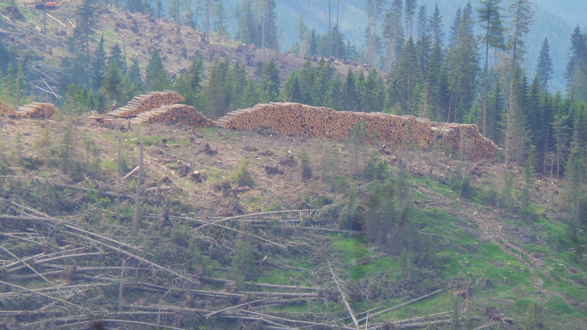 Während die wichtigsten Straßen und Wege nach wenigen Wochen wieder passierbar waren ist die Entnahme und der Abtransport der Stämme immer noch im vollen Gange, alle paar Meter begegnet einem ein Langholztransporter.