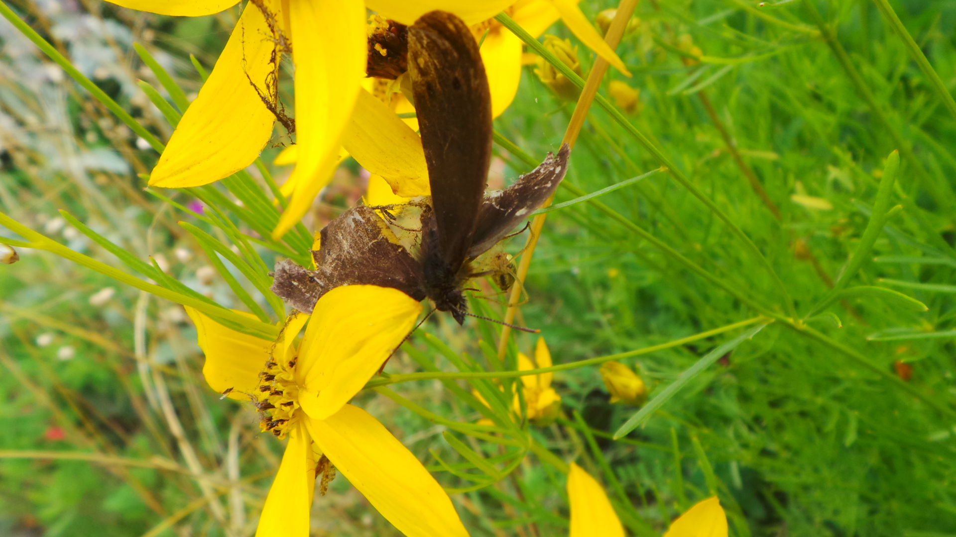 Er hatte aber die Rechnung ohne die Spinne unter der Blüte des Mädchenauges gemacht. Ein Biss, und nach zehn Minuten hatte er ausgeflattert =O :