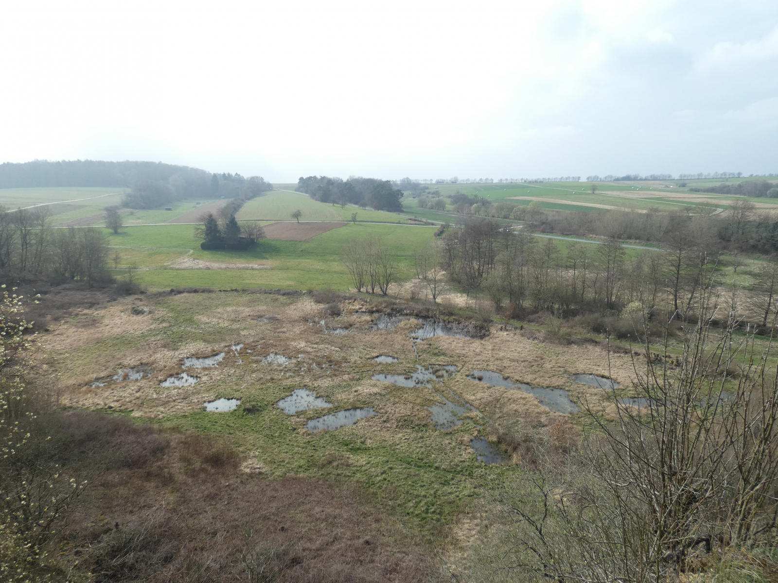 Da wir ein bisschen weiter weg von zu Hause spazieren waren, sahen wir von ganz oben ein äußerst interessantes Feuchtbiotop (Naturschutzgebiet) in einem früheren Steinbruch, von dem wir noch nie gehört hatten. Da mußten wir natürlich gleich herunterklettern und es anschauen!