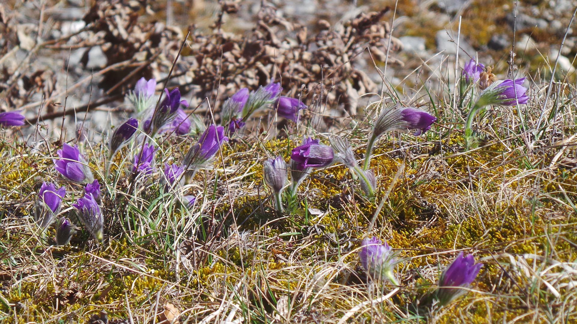 So, in der Mittagspause kurz an eine andere Stelle geradelt, ein seit 50 Jahren aufgelassener Steinbruch, und auch dort Kühchenschellen zuhauf.