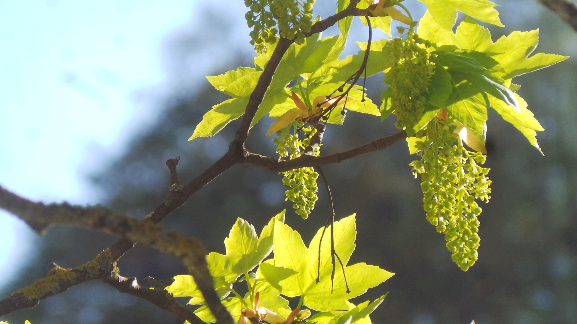 Beim Bergahorn kommen die Blüten mit dem Blattaustrieb und sind traubig angeordnet.