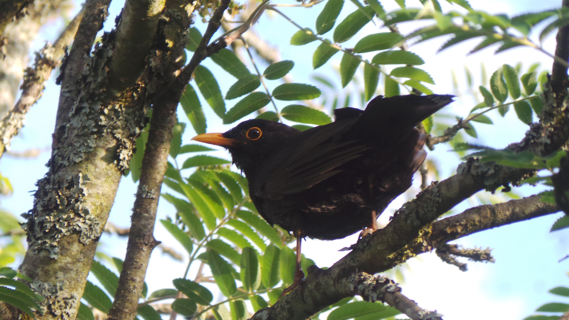 Derweil schaut der Amselpapa wohlwollend zu: