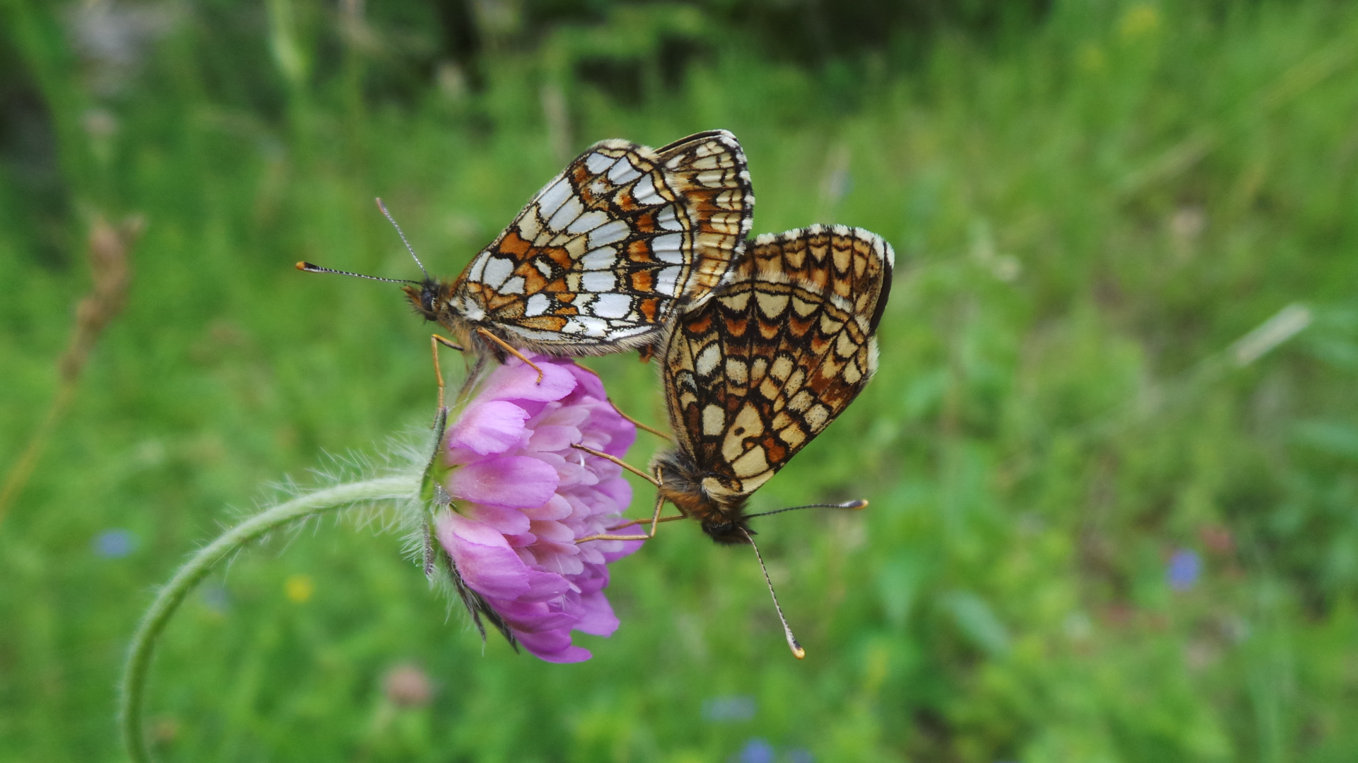 ich behaupte jetzt einfach mal, dass das zwei Östliche Scheckenfalter (Melitaea britomartis) sind, die sich hier in wackeren Übungen zum Fortbestand der Art ergehen: