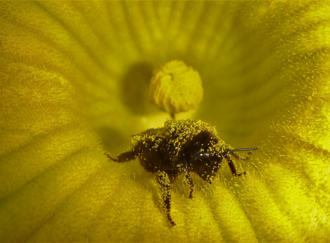 in Borsten am Unterleib transportieren.Die abgebildete Biene (an meinem "Hotel"